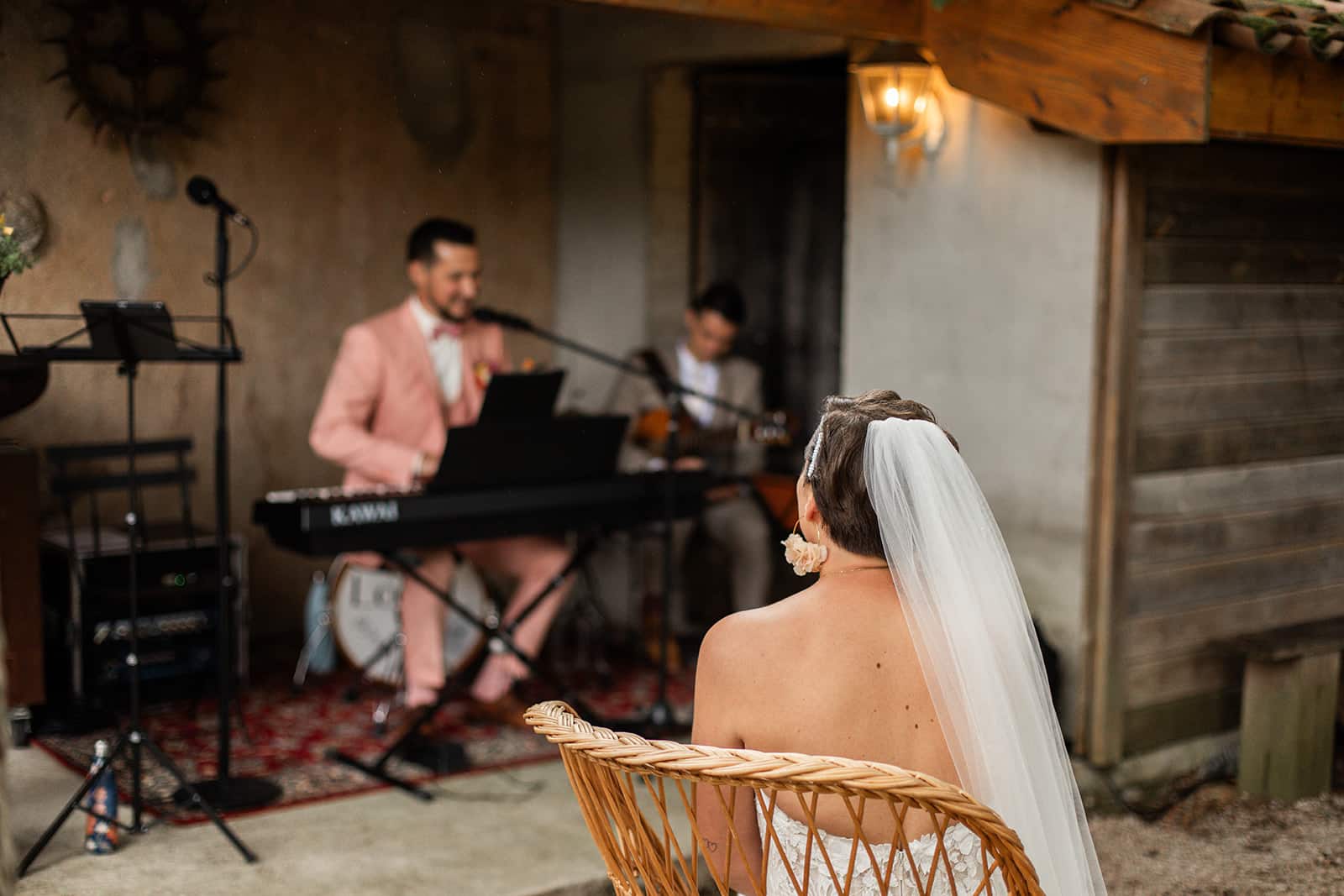 Pour Julien, l’un des moments les plus marquants a été le début de la cérémonie. Il a été particulièrement ému en entendant la bande-son surprise que j’avais enregistrée à l’avance en complicité avec le groupe de musique. C’était un moment chargé d’émotion, et je suis heureuse d’avoir pu lui faire cette surprise.