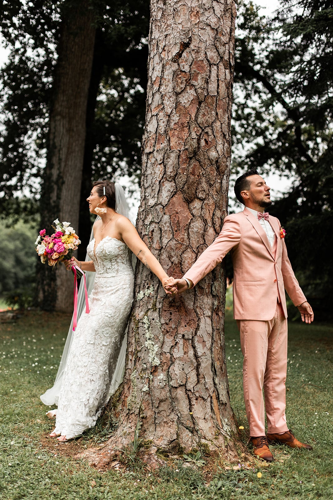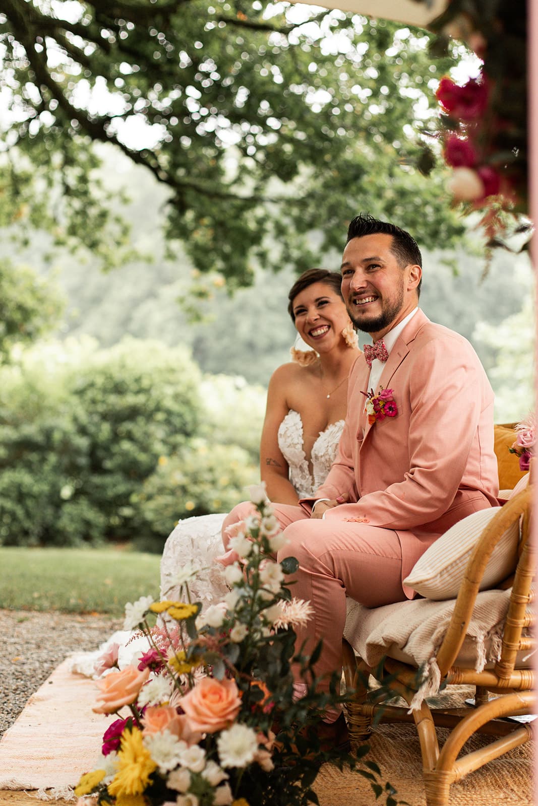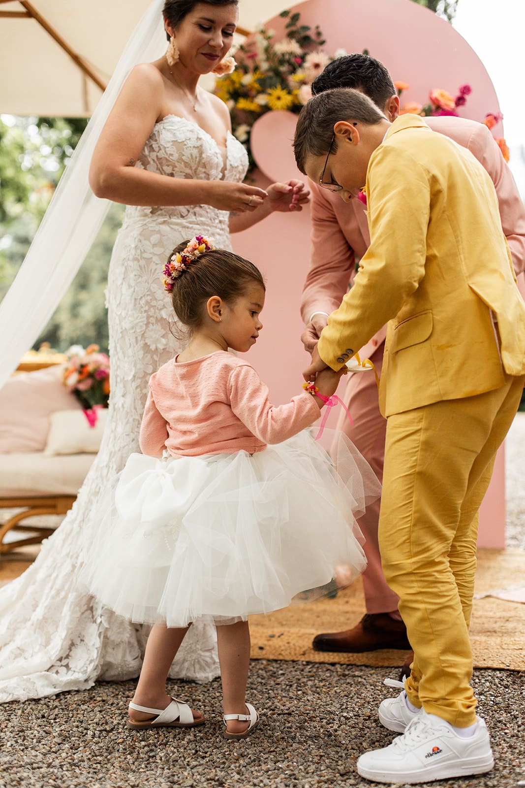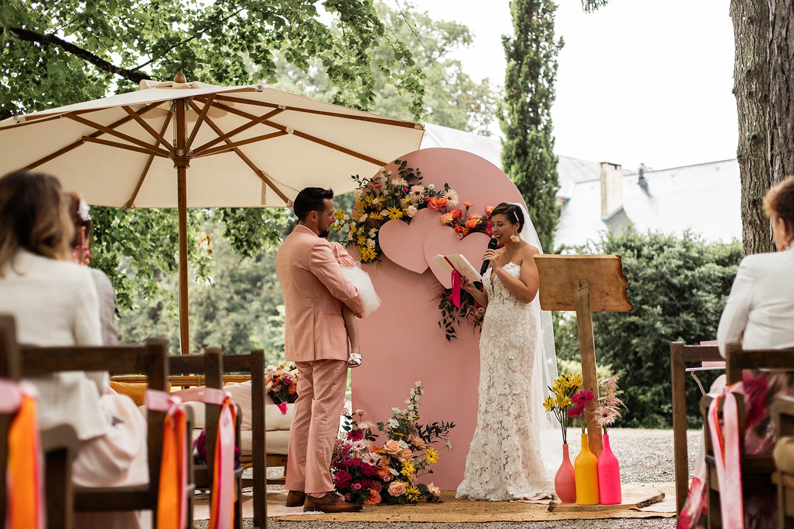 Mélodie, notre précieuse weddding-planner nous a guidés dans la construction du déroulé de la cérémonie. Elle devait initialement se dérouler à l’extérieur, mais le temps en a décidé autrement. À la dernière minute, nous avons pris la décision de la déplacer dans l’allée devant la piscine, à l’abri des grands arbres et de quelques parasols. Loin de nous déstabiliser, ce changement nous a offert un cadre intimiste et chaleureux. Ce changement de plan a ajouté une touche d’improvisation qui a rendu notre cérémonie encore plus mémorable.