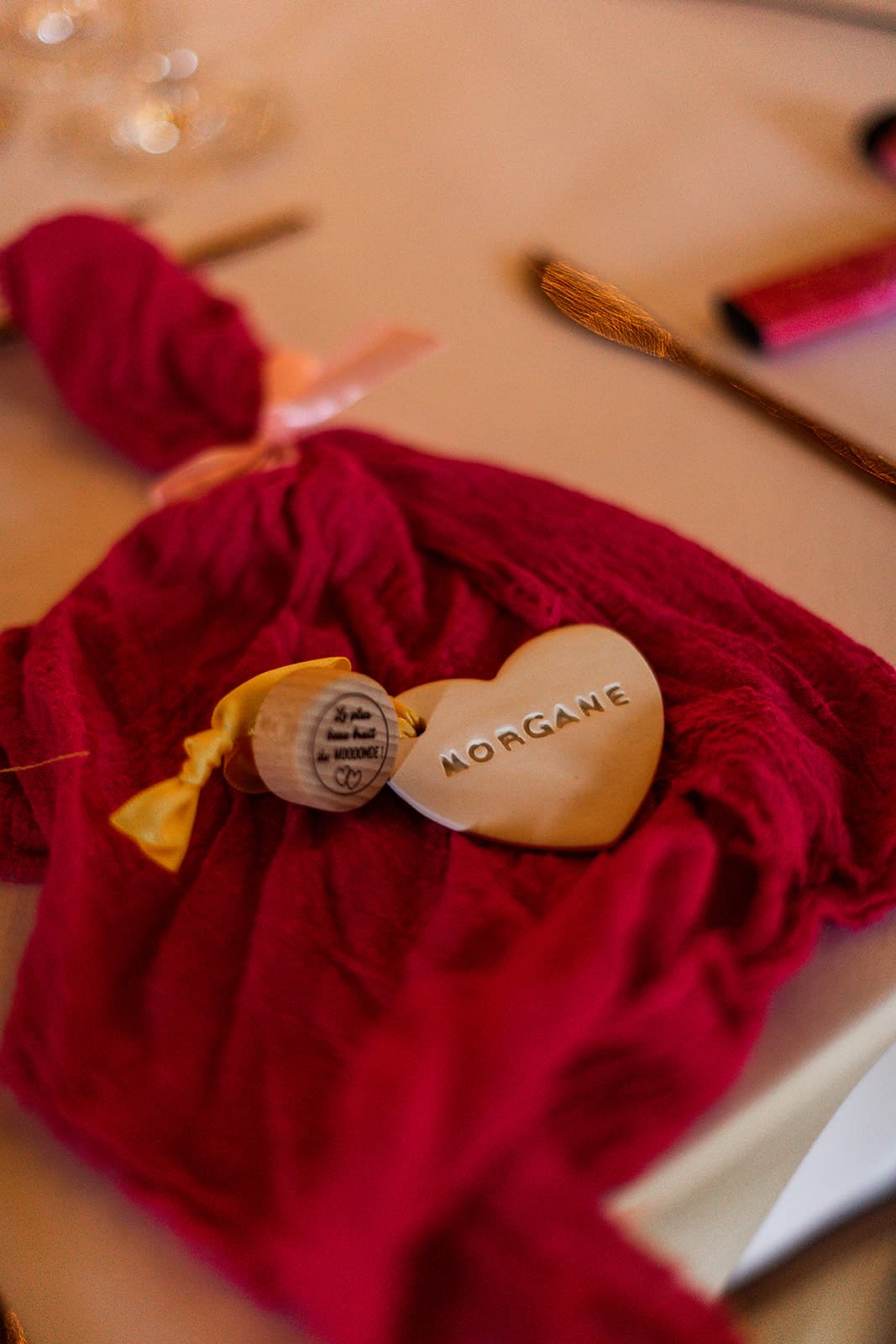 Pour nous organiser, nous avons fait appel à Mélodie, notre wedding planner, qui nous a accompagnés dans la mise en place de la décoration. Cependant, le choix des couleurs, les compositions florales… Toute l’identité visuelle, la création de la décoration a été pensée et conçue par nos soins. Nous avions une vision précise de l’aspect de notre jour J. Nous avons commencé les préparatifs deux ans avant le grand jour, ce qui nous a permis de prendre le temps de choisir chaque détail avec soin.